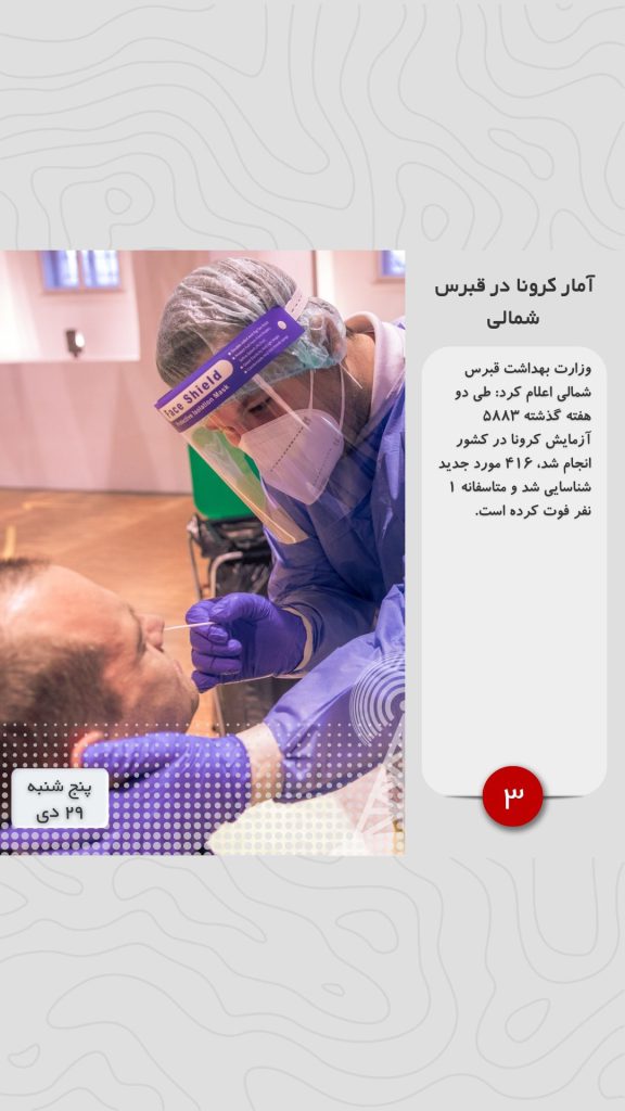 وزارت بهداشت قبرس شمالی اعلام کرد: طی دو هفته گذشته ۵۸۸۳ آزمایش کرونا در کشور انجام شد، ۴۱۶ مورد جدید شناسایی شد و متاسفانه ۱ نفر فوت کرده است.