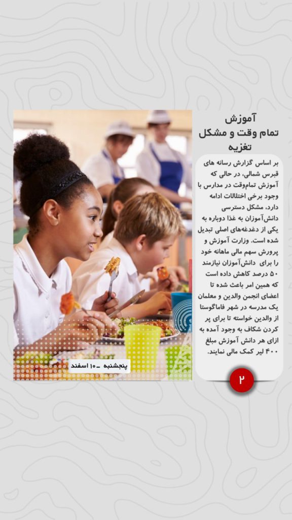 بر اساس گزارش رسانه های قبرس شمالی، در حالی که آموزش تمام‌وقت در مدارس با وجود برخی اختلالات ادامه دارد، مشکل دسترسی دانش‌آموزان به غذا دوباره به یکی از دغدغه‌های اصلی تبدیل شده است. وزارت آموزش و پرورش سهم مالی ماهانه خود را برای دانش‌آموزان نیازمند ۵۰ درصد کاهش داده است که همین امر باعث شده تا اعضای انجمن والدین و معلمان یک مدرسه در شهر فاماگوستا از والدین خواسته تا برای پر کردن شکاف به وجود آمده به ازای هر دانش آموزش مبلغ ۴۰۰ لیر کمک مالی نمایند.