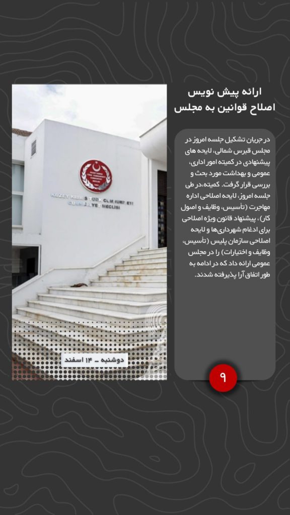 در جریان تشکیل جلسه امروز در مجلس قبرس شمالی، لایحه های پیشنهادی در کمیته امور اداری، عمومی و بهداشت مورد بحث و بررسی قرار گرفت. کمیته،در طی جلسه امروز، لایحه اصلاحی اداره مهاجرت (تأسیس، وظایف و اصول کار)، پیشنهاد قانون ویژه اصلاحی برای ادغام شهرداریها و لایحه اصلاحی سازمان پلیس (تأسیس، وظایف و اختیارات) را در مجلس عمومی ارائه داد که در ادامه به طور اتفاق آرا پذیرفته شدند.