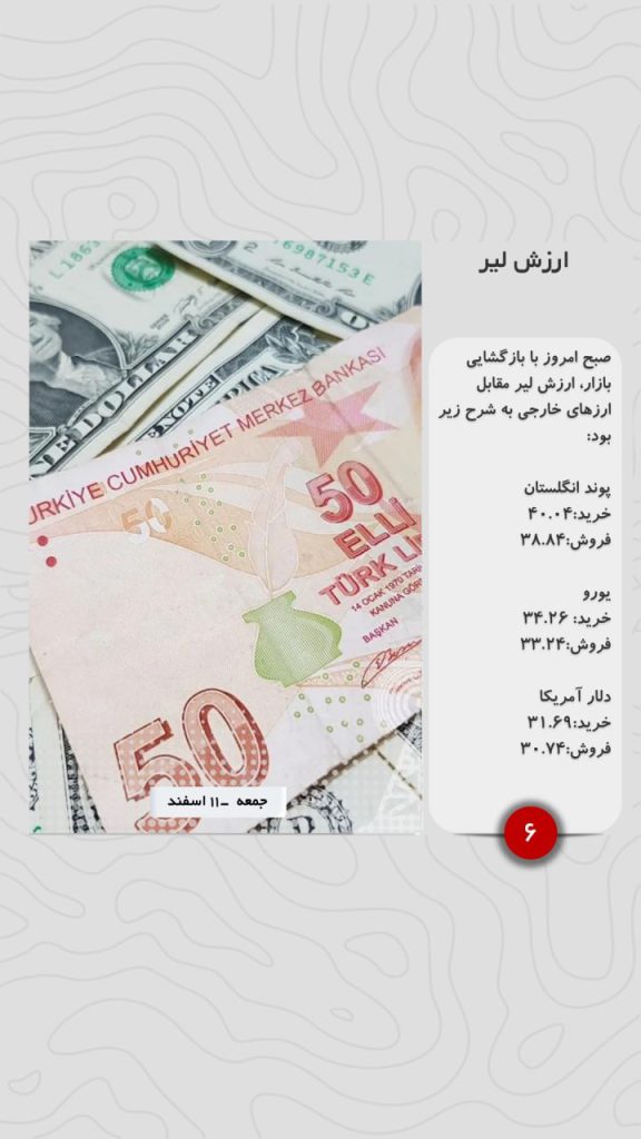 صبح امروز با بازگشایی بازار، ارزش لیر مقابل ارزهای خارجی به شرح زیر بود: