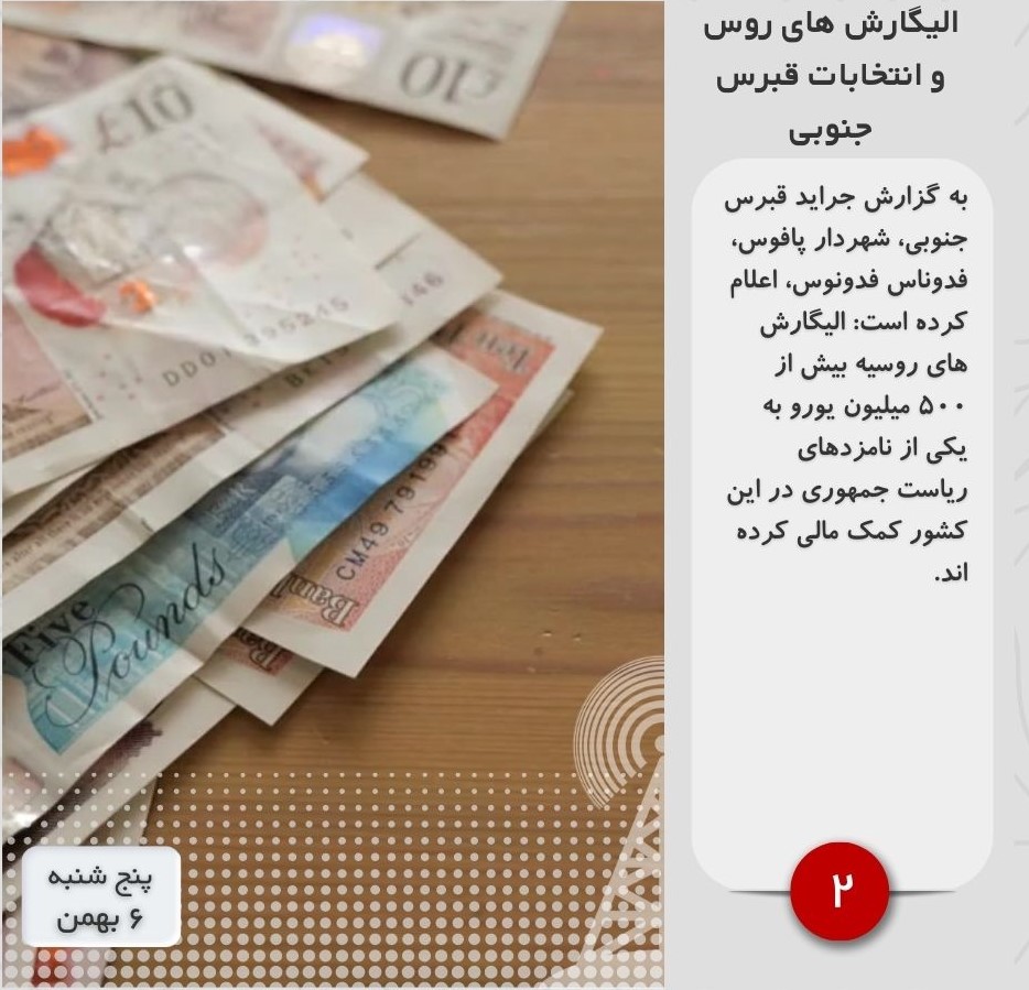 به گزارش جراید قبرس جنوبی، شهردار پافوس، فدوناس فدونوس، اعلام کرده است: الیگارش های روسیه بیش از ۵۰۰ میلیون یورو به یکی از نامزدهای ریاست جمهوری در این کشور کمک مالی کرده اند.