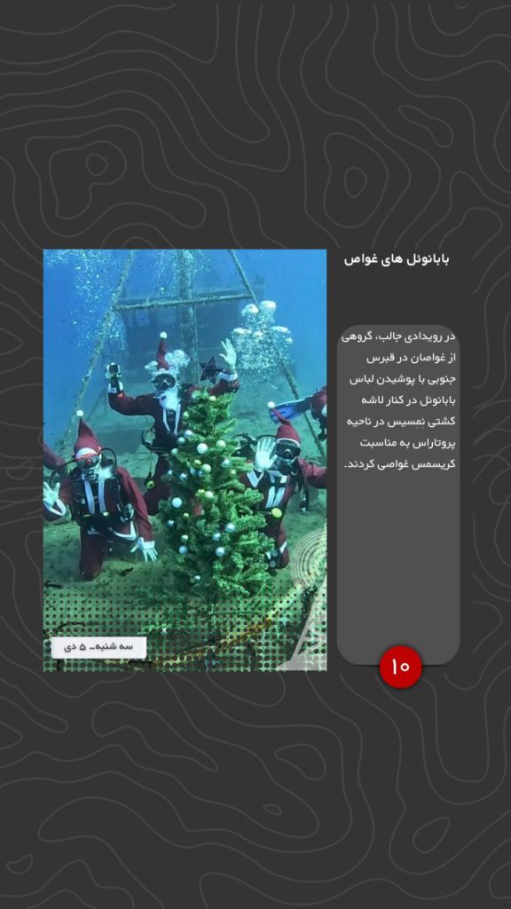 در رویدادی جالب، گروهی از غواصان در قبرس جنوبی با پوشیدن لباس بابانوئل در کنار لاشه کشتی نِمِسیس در ناحیه پروتاراس به مناسبت کریسمس غواصی کردند.