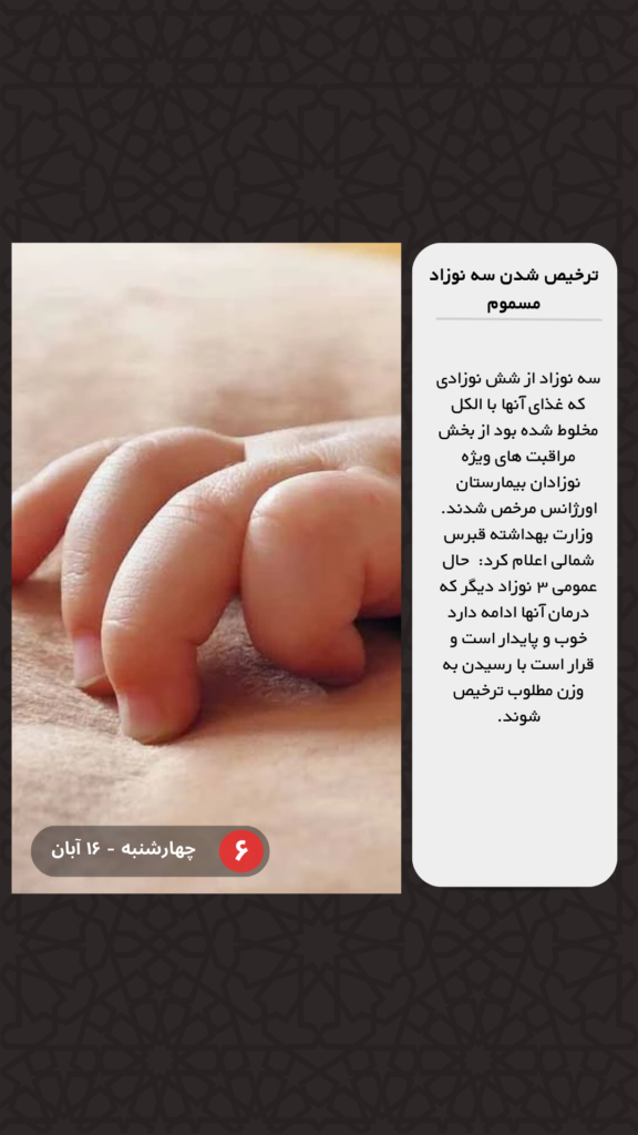 سه نوزاد از شش نوزادی که غذای آنها با الکل مخلوط شده بود از بخش مراقبت های ویژه نوزادان بیمارستان اورژانس مرخص شدند. وزارت بهداشته قبرس شمالی اعلام کرد: حال عمومی ۳ نوزاد دیگر که درمان آنها ادامه دارد خوب و پایدار است و قرار است با رسیدن به وزن مطلوب ترخیص شوند.