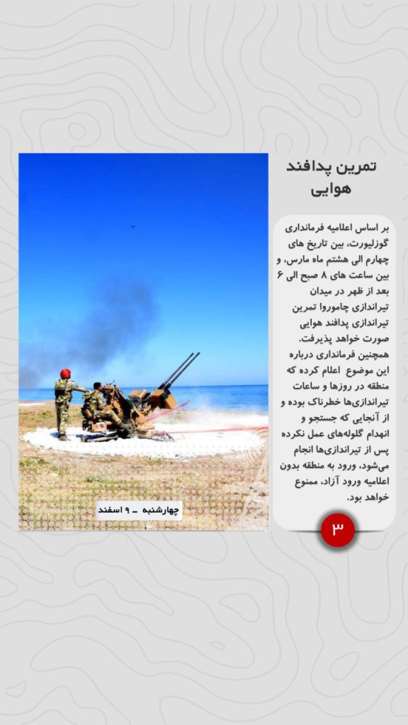 بر اساس اعلامیه فرمانداری گوزلیورت، بین تاریخ های چهارم الی هشتم ماه مارس، و بین ساعت های ۸ صبح الی ۶ بعد از ظهر در میدان تیراندازی چاموروا تمرین تیراندازی پدافند هوایی صورت خواهد پذیرفت. همچنین فرمانداری درباره این موضوع اعلام کرده که منطقه در روزها و ساعات تیراندازی‌ها خطرناک بوده و از آنجایی که جستجو و انهدام گلوله‌های عمل نکرده پس از تیراندازی‌ها انجام می‌شود، ورود به منطقه بدون اعلامیه ورود آزاد، ممنوع خواهد بود.