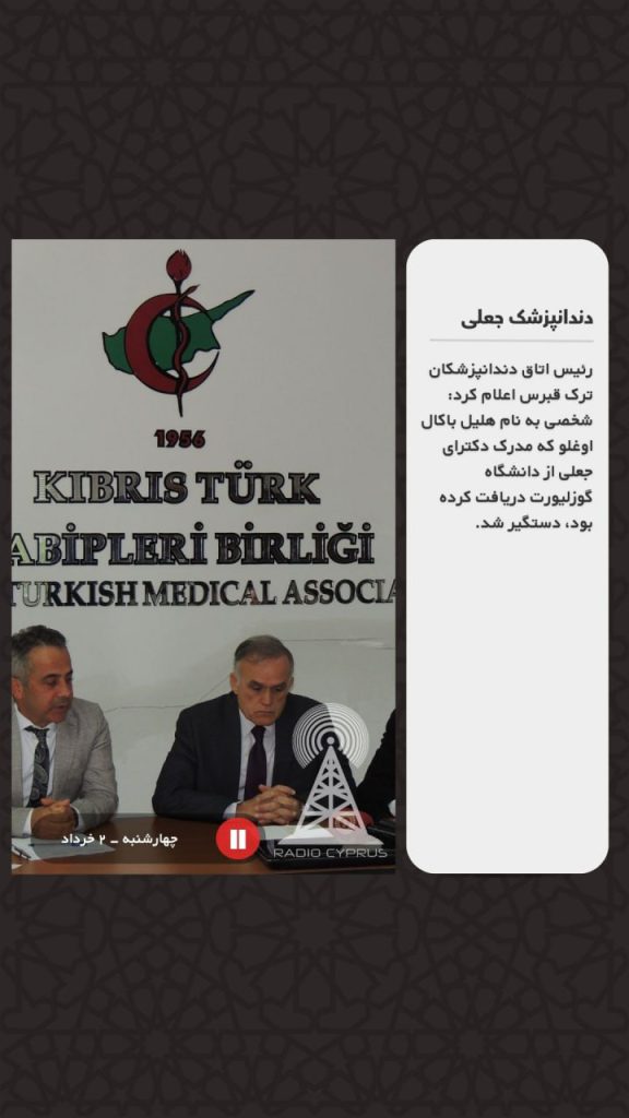 رئیس اتاق دندانپزشکان ترک قبرس اعلام کرد: شخصی به نام هلیل باکال اوغلو که مدرک دکترای جعلی از دانشگاه گوزلیورت دریافت کرده بود، دستگیر شد.