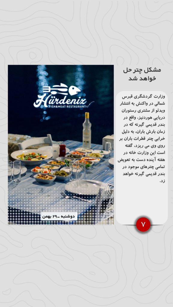 وزارت گردشگری قبرس شمالی در واکنش به انتشار ویدئو از مشتری رستوران دریایی هوردنیز، واقع در بندر قدیمی گیرنه که در زمان بارش باران، به دلیل خرابی چتر قطرات باران بر روی وی می ریزد، گفته است این وزارت خانه در هفته آینده دست به تعویض تمامی چترهای موجود در بندر قدیمی گیرنه خواهد زد.
