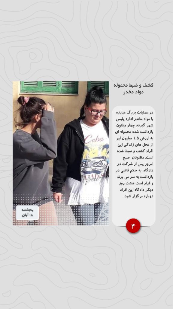 در عملیات بزرگ مبارزه با مواد مخدر اداره پلیس شهر گیرنه، چهار مظنون بازداشت شده محموله ای به ارزش ۱.۵ میلیون لیر از محل های زندگی این افراد کشف و ضبط شده است. مظنونان صبح امروز پس از شرکت در دادگاه، به حکم قاضی در بازداشت به سر می برند و قرار است هشت روز دیگر دادگاه این افراد دوباره برگزار شود.