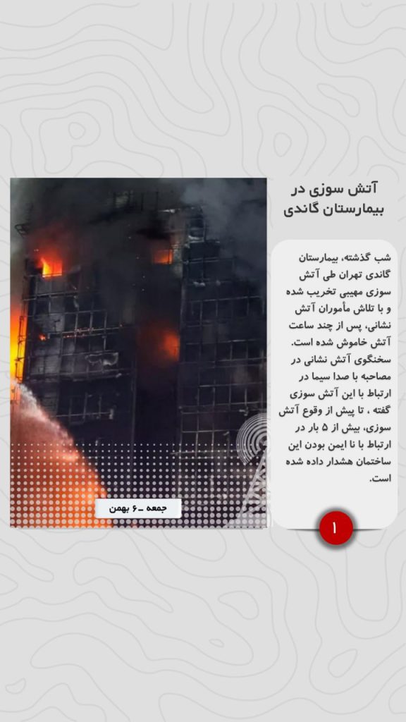 شب گذشته، بیمارستان گاندی تهران طی آتش سوزی مهیبی تخریب شده و با تلاش مأموران آتش نشانی، پس از چند ساعت آتش خاموش شده است. سخنگوی آتش نشانی در مصاحبه با صدا سیما در ارتباط با این آتش سوزی گفته ، تا پیش از وقوع آتش سوزی، بیش از ۵ بار در ارتباط با نا ایمن بودن این ساختمان هشدار داده شده است.
