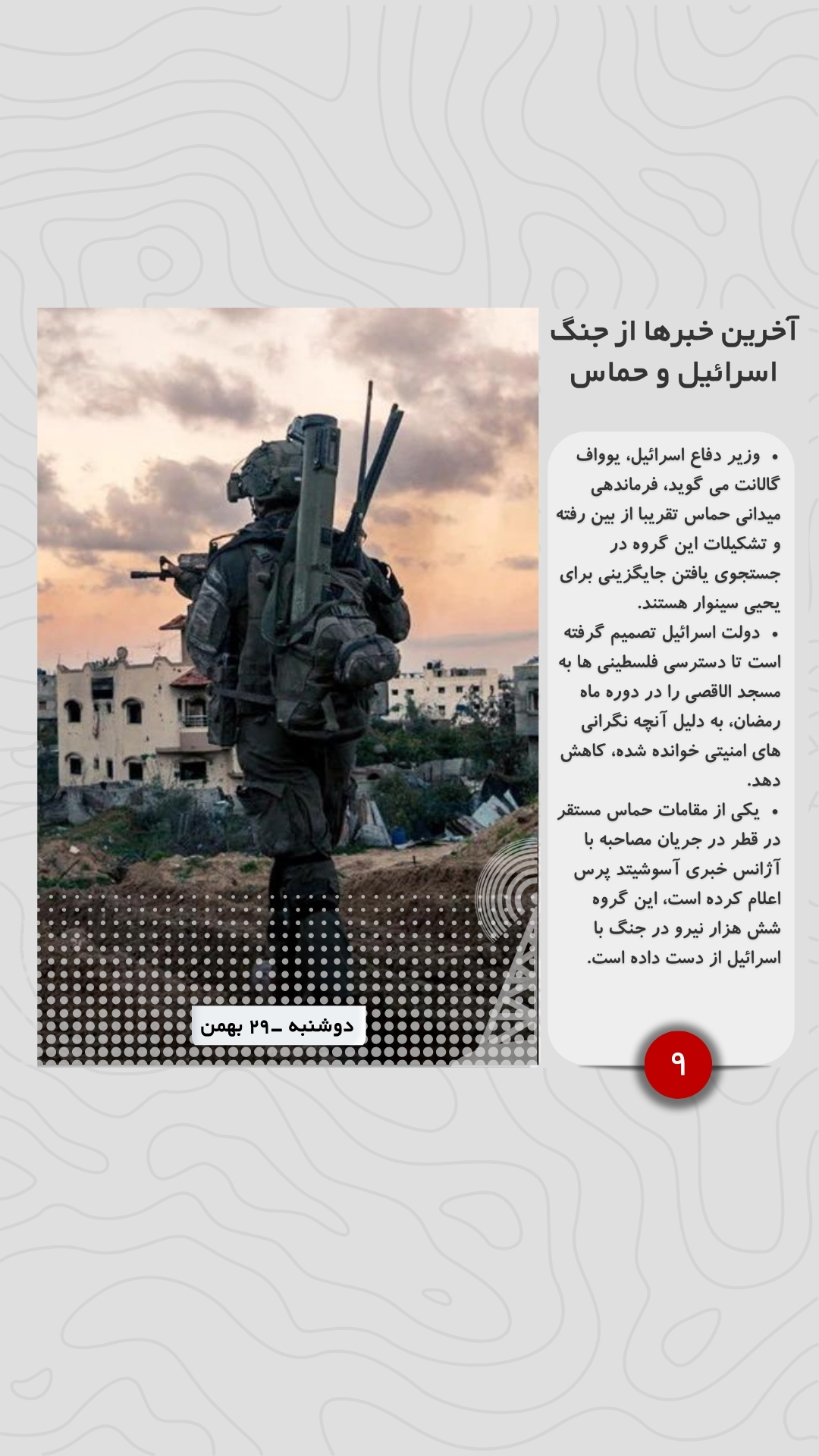 • وزیر دفاع اسرائیل، یوواف گالانت می گوید، فرماندهی میدانی حماس تقریبا از بین رفته و تشکیلات این گروه در جستجوی یافتن جایگزینی برای یحیی سینوار هستند.