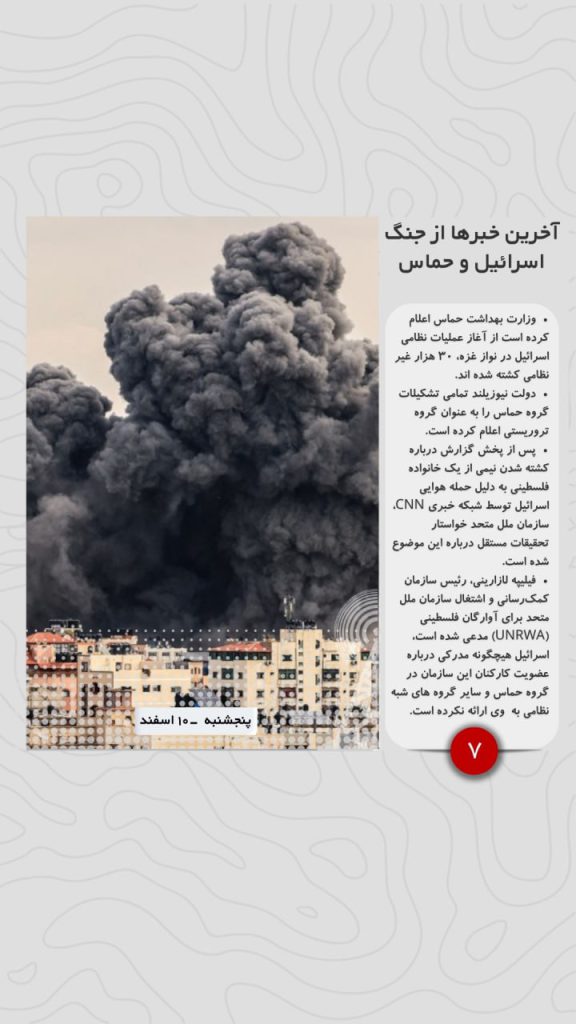 • پس از پخش گزارش درباره کشته شدن نیمی از یک خانواده فلسطینی به دلیل حمله هوایی اسرائیل توسط شبکه خبری CNN، سازمان ملل متحد خواستار تحقیقات مستقل درباره این موضوع شده است.