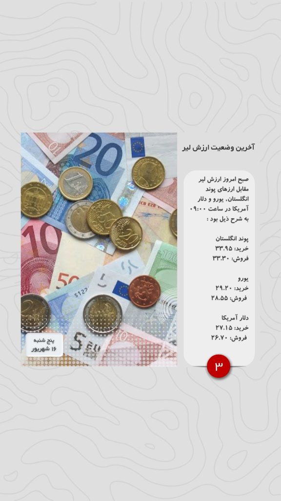 صبح امروز ارزش لیر مقابل ارزهای پوند انگلستان, یورو و دلار آمریکا در ساعت ۰۹:۰۰ به شرح ذیل بود :