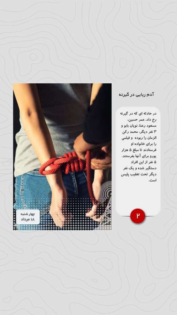 در حادثه ای که در گیرنه رخ داد، عمر حسین، مسعود رعنا، نویان بابو و ۳ نفر دیگر، محمد رکن الزمان را ربوده و فیلمی را برای خانواده او فرستادند تا مبلغ ۵ هزار یورو برای آنها بفرستند. ۵ نفر از این افراد دستگیر شده و یک نفر دیگر تحت تعقیب پلیس است.