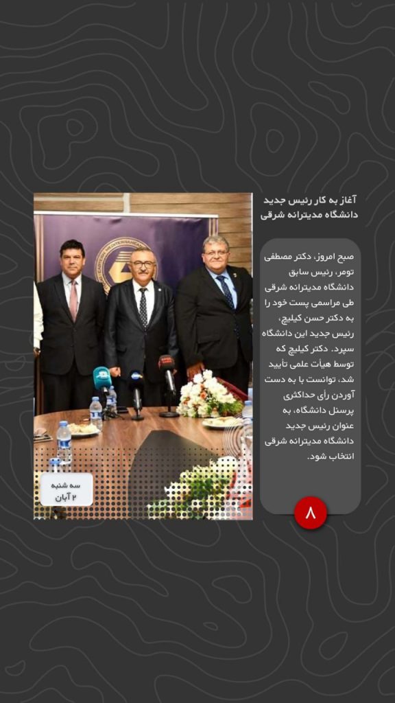 صبح امروز، دکتر مصطفی تومر، رئیس سابق دانشگاه مدیترانه شرقی طی مراسمی پست خود را به دکتر حسن کیلیچ، رئیس جدید این دانشگاه سپرد. دکتر کیلیچ که توسط هیأت علمی تأیید شد، توانست با به دست آوردن رأی حداکثری پرسنل دانشگاه، به عنوان رئیس جدید دانشگاه مدیترانه شرقی انتخاب شود.