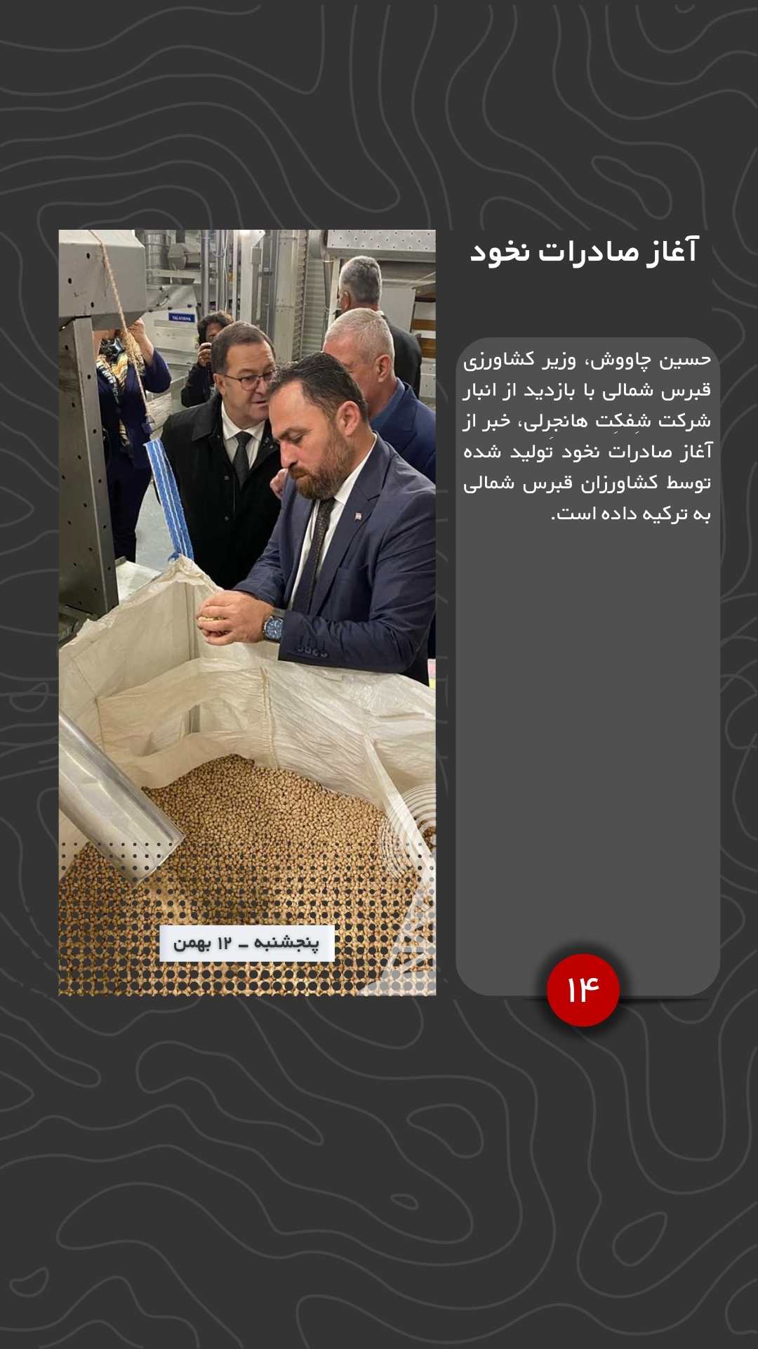 حسین چاووش، وزیر کشاورزی قبرس شمالی با بازدید از انبار شرکت شِفکِت هانجِرلی، خبر از آغاز صادرات نخود تولید شده توسط کشاورزان قبرس شمالی به ترکیه داده است.