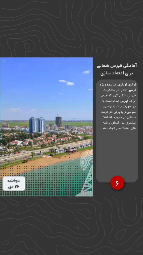 ارگون اولگون، نماینده ویژه ارسین تاتار در مذاکرات قبرس، تأکید کرد که طرف ترک قبرس آماده است تا در صورت رعایت برابری سیاسی و پذیرش دو دولت مستقل در جزیره، اقدامات بیشتری در راستای برنامه های اعتماد ساز انجام دهد.