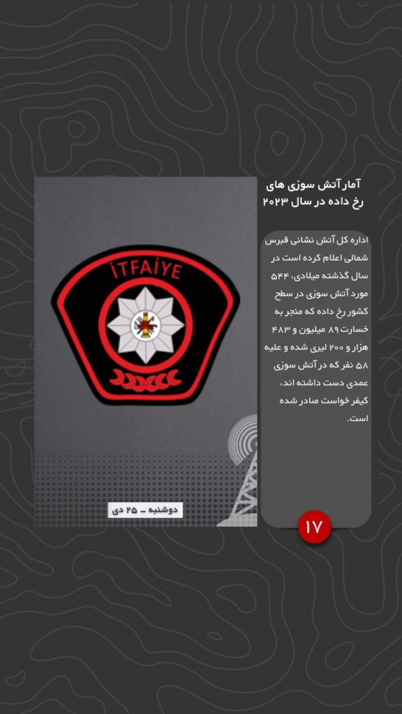 اداره کل آتش نشانی قبرس شمالی اعلام کرده است در سال گذشته میلادی، ۵۴۴ مورد آتش سوزی در سطح کشور رخ داده که منجر به خسارت ۸۹ میلیون و ۴۸۳ هزار و ۲۰۰ لیری شده و علیه ۵۸ نفر که در آتش سوزی عمدی دست داشته اند، کیفر خواست صادر شده است.