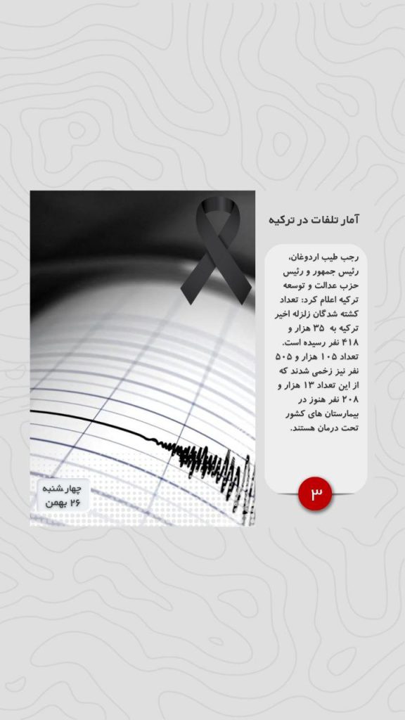 رجب طیب اردوغان، رئیس جمهور و رئیس حزب عدالت و توسعه ترکیه اعلام کرد: تعداد کشته شدگان زلزله اخیر ترکیه به ۳۵ هزار و ۴۱۸ نفر رسیده است. تعداد ۱۰۵ هزار و ۵۰۵ نفر نیز زخمی شدند که از این تعداد ۱۳ هزار و ۲۰۸ نفر هنوز در بیمارستان های کشور تحت درمان هستند.