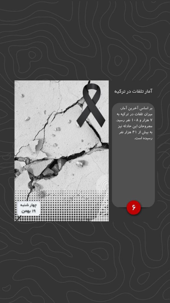 بر اساس آخرین آمار، میزان تلفات در ترکیه به ۷ هزار و ۱۰۸ نفر رسید. مجروحان این حادثه نیز به بیش از ۴۱ هزار نفر رسیده است.