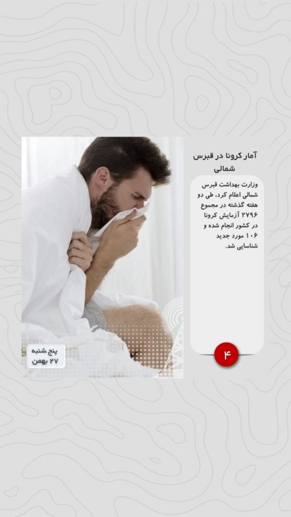 وزارت بهداشت قبرس شمالی اعلام کرد، طی دو هفته گذشته در مجموع ۲۷۹۶ آزمایش کرونا در کشور انجام شده و ۱۰۶ مورد جدید شناسایی شد.
