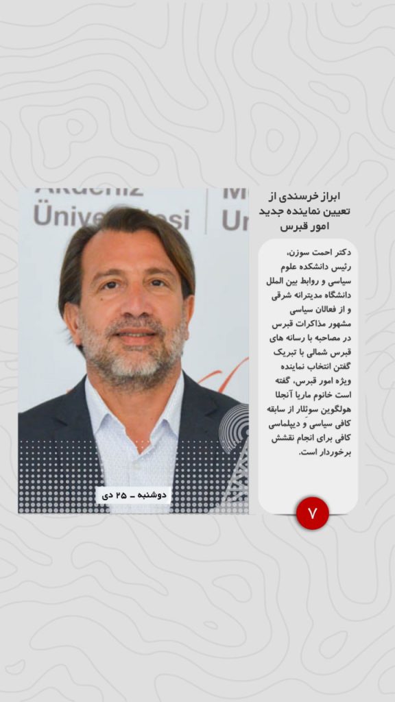 دکتر احمت سوزن، رئیس دانشکده علوم سیاسی و روابط بین الملل دانشگاه مدیترانه شرقی و از فعالان سیاسی مشهور مذاکرات قبرس در مصاحبه با رسانه های قبرس شمالی با تبریک گفتن انتخاب نماینده ویژه امور قبرس، گفته است خانوم ماریا آنجلا هولگوین سوئِلار از سابقه کافی سیاسی و دیپلماسی کافی برای انجام نقشش برخوردار است.