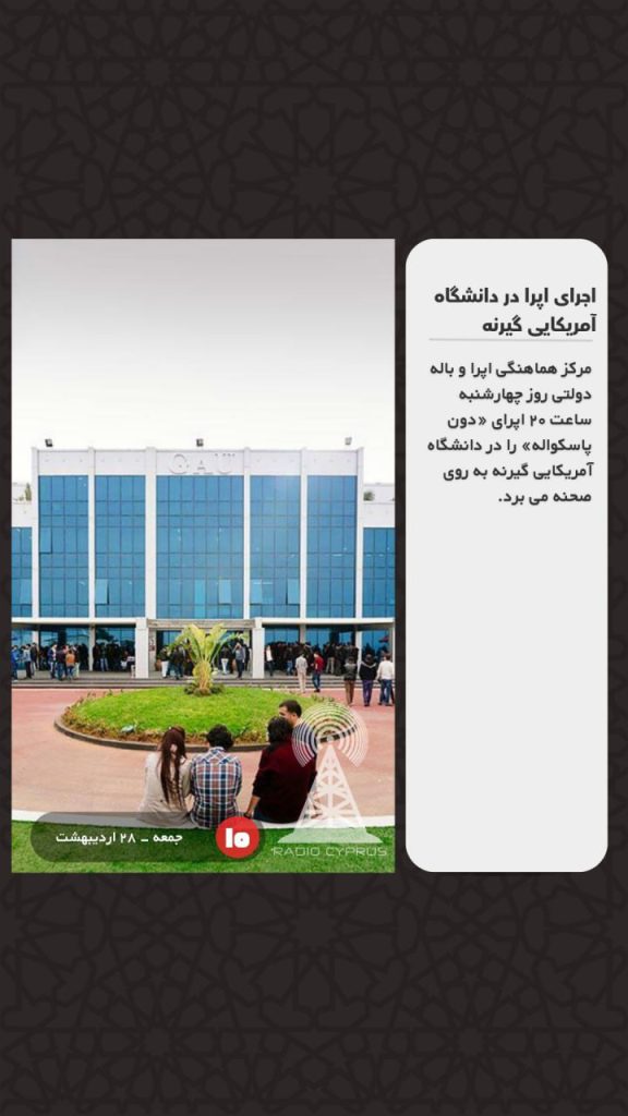 مرکز هماهنگی اپرا و باله دولتی روز چهارشنبه ساعت ۲۰ اپرای «دون پاسکواله» را در دانشگاه آمریکایی گیرنه به روی صحنه می برد.