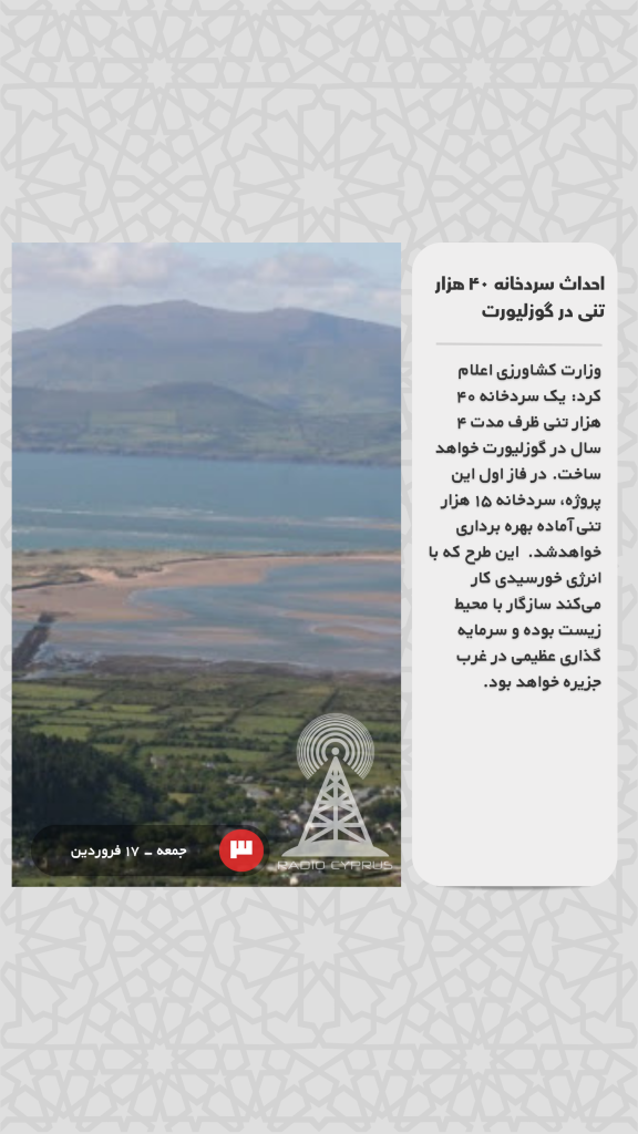 وزارت کشاورزی اعلام کرد: یک سردخانه ۴۰ هزار تنی ظرف مدت ۴ سال در گوزلیورت خواهد ساخت. در فاز اول این پروژه، سردخانه ۱۵ هزار تنی آماده بهره برداری خواهدشد. این طرح که با انرژی خورسیدی کار میکند سازگار با محیط زیست بوده و سرمایه گذاری عظیمی در غرب جزیره خواهد بود.