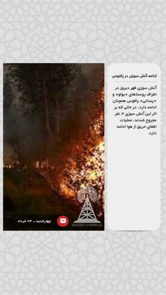 آتش سوزی ظهر دیروز در اطراف روستاهای «یولو» و «پساتی» پافوس همچنان ادامه دارد. در حالی که بر اثر این آتش سوزی ۳ نفر مجروح شدند، عملیات اطفای حریق از هوا ادامه دارد.