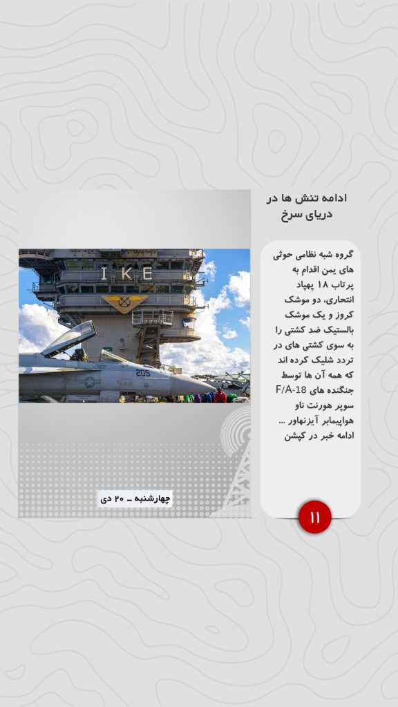 گروه شبه نظامی حوثی های یمن اقدام به پرتاب ۱۸ پهپاد انتحاری، دو موشک کروز و یک موشک بالستیک ضد کشتی را به سوی کشتی های در تردد شلیک کرده اند که همه آن ها توسط جنگنده های F/A-18 سوپر هورنت ناو هواپیمابر آیزنهاور، ناوشکن های گریولی، لابون و میسون نیروی دریایی آمریکا و ناوشکن دایاموند نیروی دریایی سلطنتی بریتانیا رهگیری و منهدم شده اند. از سویی دیگر سنگاپور و سریلانکا نیز خبر از اعزام ناوهای جنگی و پیوستن به ائتلاف بین المللی دریایی برای تأمین امنیت دریایی تنگه باب المندب و دریای سرخ داده اند.