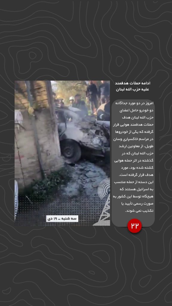 امروز در دو مورد جداگانه دو خودرو حامل اعضای حزب الله لبنان هدف حملات هدفمند هوایی قرار گرفته که یکی از خودروها در مراسم خاکسپاری وسان طویل، از معاونین ارشد حزب الله لبنان که در گذشته در اثر حمله هوایی کشته شده بود، مورد هدف قرار گرفته است. این دسته از حمله منتسب به اسرائیل هستند که هیچگاه توسط این کشور به صورت رسمی تأیید یا تکذیب نمی شوند.