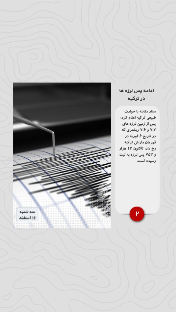 ستاد مقابله با حوادث طبیعی ترکیه اعلام کرد: پس از زمین لرزه های ۷.۷ و ۷.۶ ریشتری که در تاریخ ۶ فوریه در قهرمان ماراش ترکیه رخ داد، تاکنون ۱۳ هزار و ۷۵۳ پس لرزه به ثبت رسیده است.
