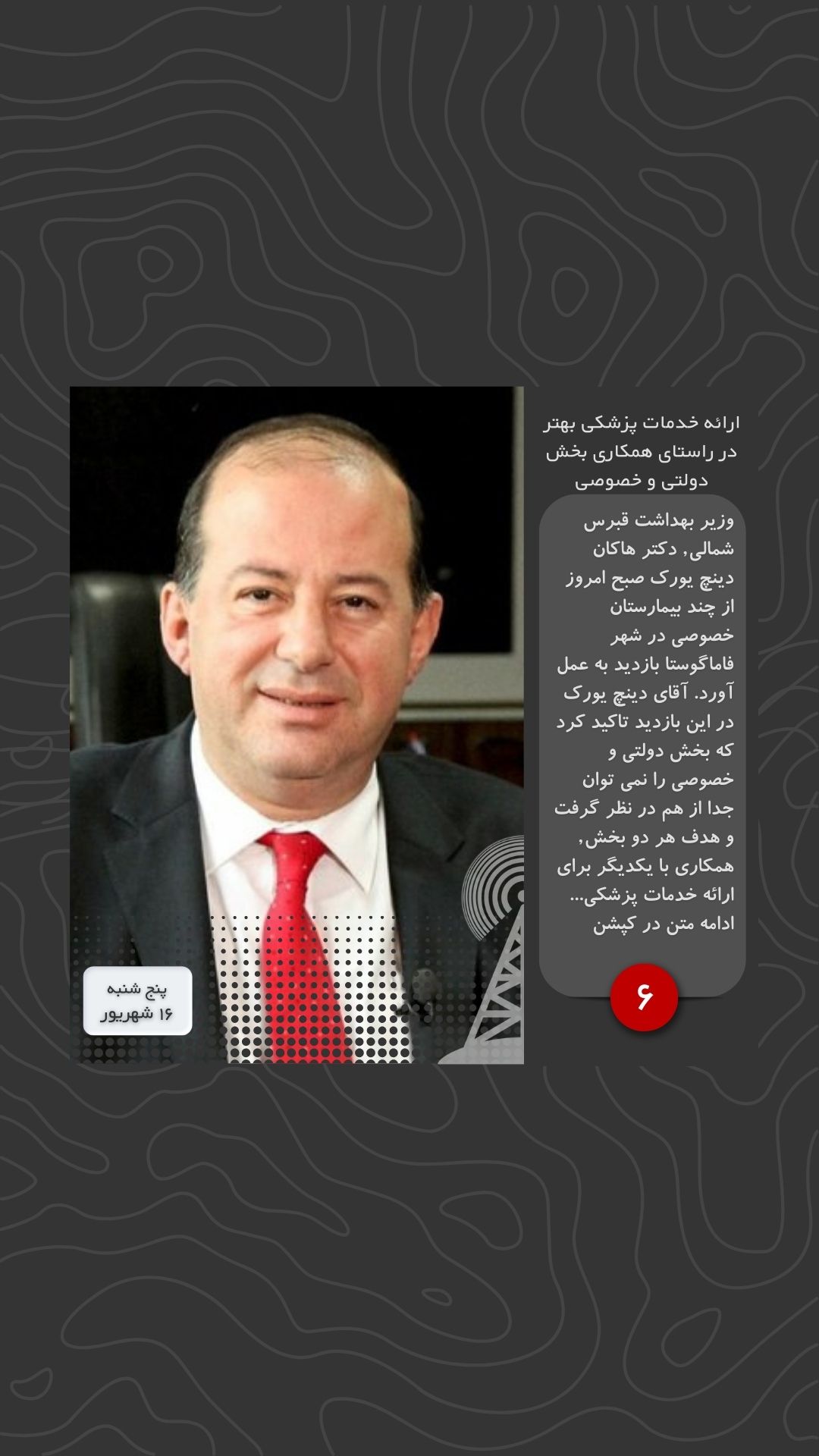 وزیر بهداشت قبرس شمالی, دکتر هاکان دینچ یورک صبح امروز از چند بیمارستان خصوصی در شهر فاماگوستا بازدید به عمل آورد. آقای دینچ یورک در این بازدید تاکید کرد که بخش دولتی و خصوصی را نمی توان جدا از هم در نظر گرفت و هدف هر دو بخش, همکاری با یکدیگر برای ارائه خدمات پزشکی در خور شهروندان است. وزیر بهداشت همچنین دلیل اصلی بازدید خود را شنیدن مشکلات و پیشنهادات بخش خصوصی عنوان کرده است.