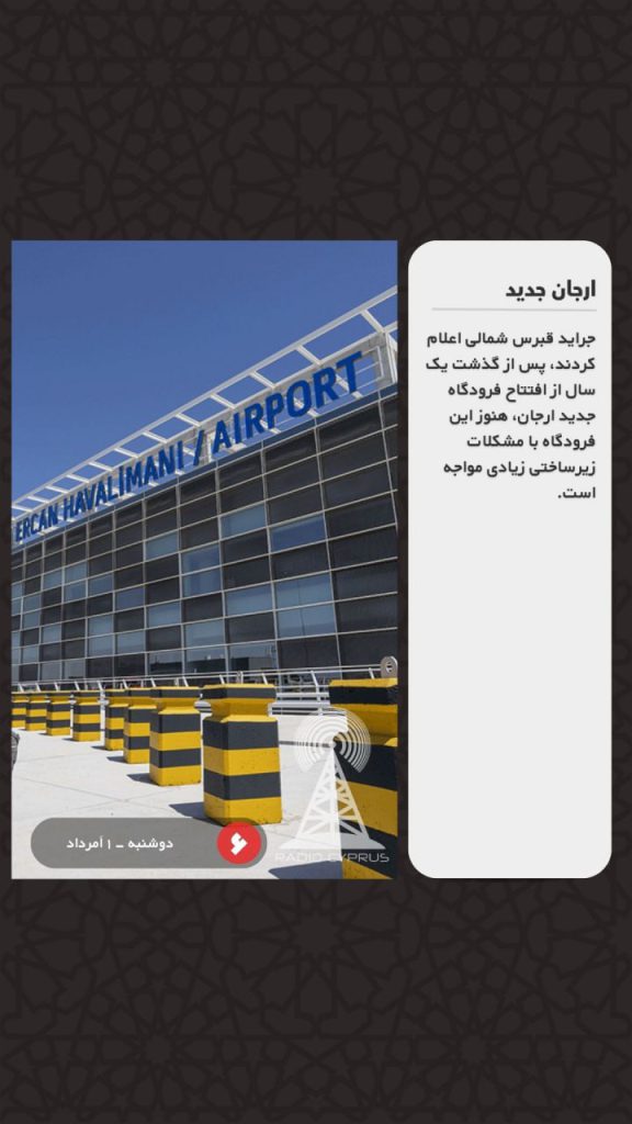 جراید قبرس شمالی اعلام کردند، پس از گذشت یک سال از افتتاح فرودگاه جدید ارجان، هنوز این فرودگاه با مشکلات زیرساختی زیادی مواجه است.