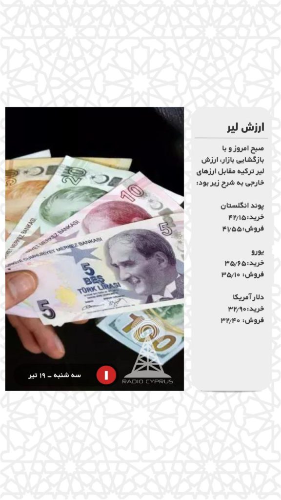 صبح امروز و با بازگشایی بازار، ارزش لیر ترکیه مقابل ارزهای خارجی به شرح زیر بود: