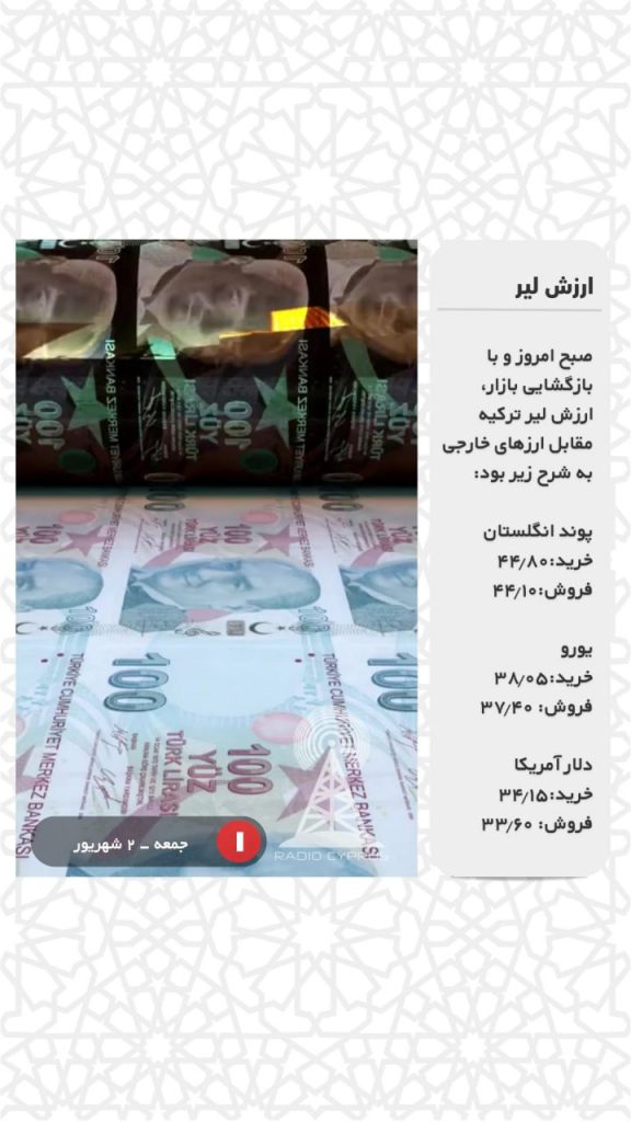 صبح امروز و با بازگشایی بازار، ارزش لیر ترکیه مقابل ارزهای خارجی به شرح زیر بود:
