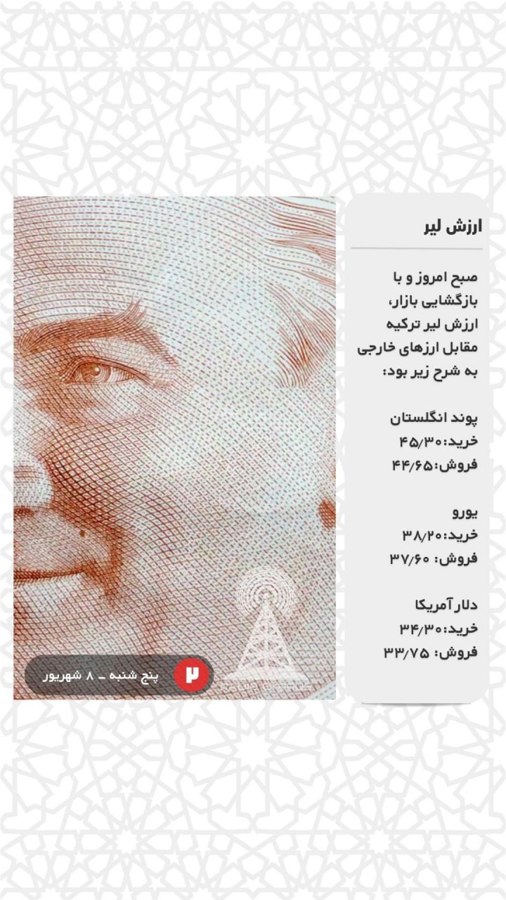 صبح امروز و با بازگشایی بازار، ارزش لیر ترکیه مقابل ارزهای خارجی به شرح زیر بود: