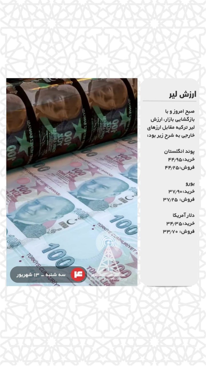 صبح امروز و با بازگشایی بازار، ارزش لیر ترکیه مقابل ارزهای خارجی به شرح زیر بود: