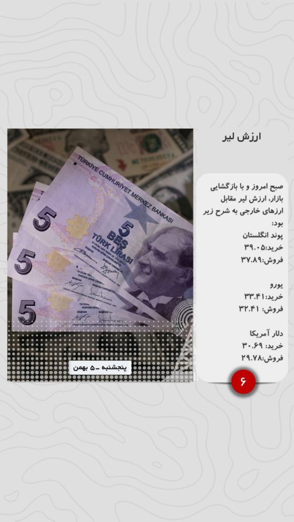 صبح امروز و با بازگشایی بازار، ارزش لیر مقابل ارزهای خارجی به شرح زیر بود: