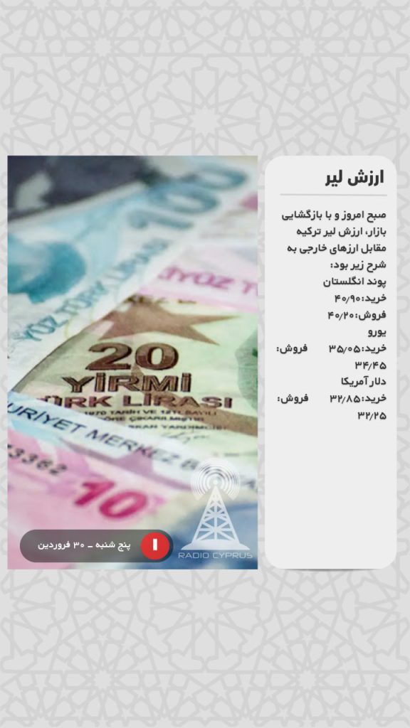 صبح امروز و با بازگشایی بازار، ارزش لیر ترکیه مقابل ارزهای خارجی به شرح زیر بود: