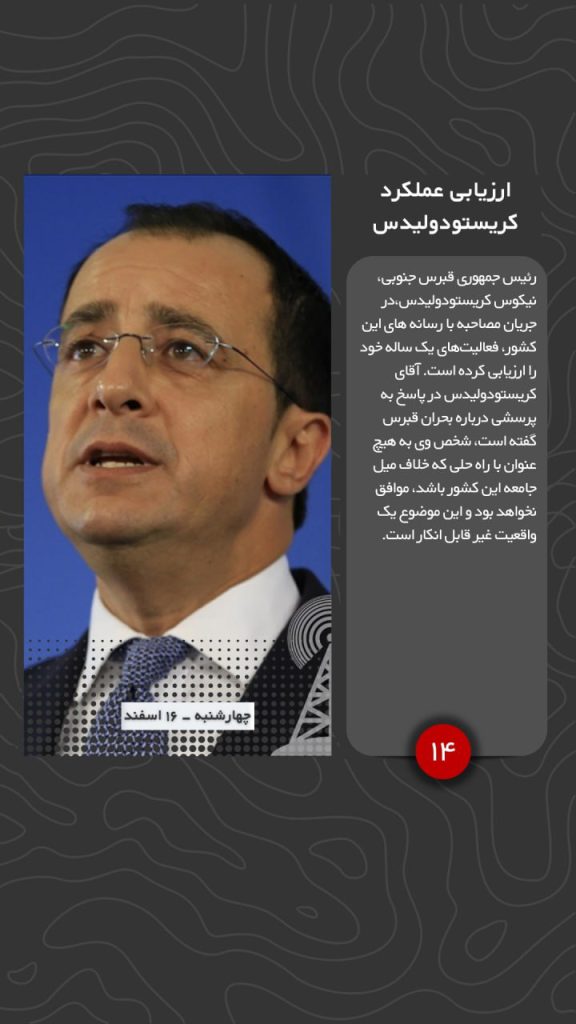 رئیس جمهوری قبرس جنوبی، نیکوس کریستودولیدس،در جریان مصاحبه با رسانه های این کشور، فعالیتهای یک ساله خود را ارزیابی کرده است. آقای کریستودولیدس در پاسخ به پرسشی درباره بحران قبرس گفته است، شخص وی به هیچ عنوان با راه حلی که خلاف میل جامعه این کشور باشد، موافق نخواهد بود و این موضوع یک واقعیت غیر قابل انکار است.