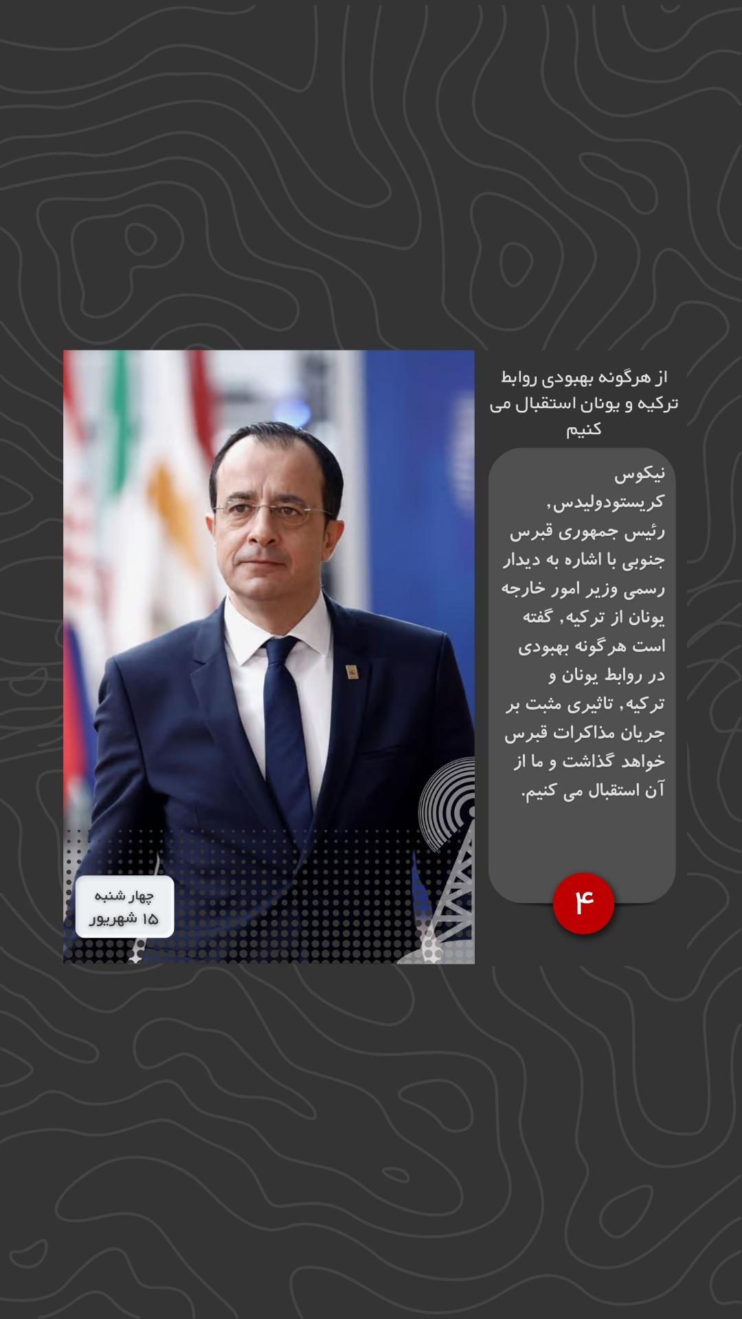 نیکوس کریستودولیدس, رئیس جمهوری قبرس جنوبی با اشاره به دیدار رسمی وزیر امور خارجه یونان از ترکیه, گفته است هرگونه بهبودی در روابط یونان و ترکیه, تاثیری مثبت بر جریان مذاکرات قبرس خواهد گذاشت و ما از آن استقبال می کنیم.