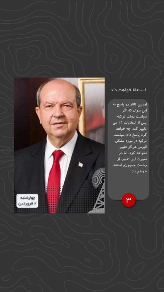 ارسین تاتار در پاسخ به این سوال که اگر سیاست دولت ترکیه پس از انتخابات ۱۴ می تغییر کند، چه خواهد کرد پاسخ داد: سیاست ترکیه در مورد مشکل قبرس هرگز تغییر نخواهد کرد. اما در صورت این تغییر، از ریاست جمهوری استعفا خواهم داد.