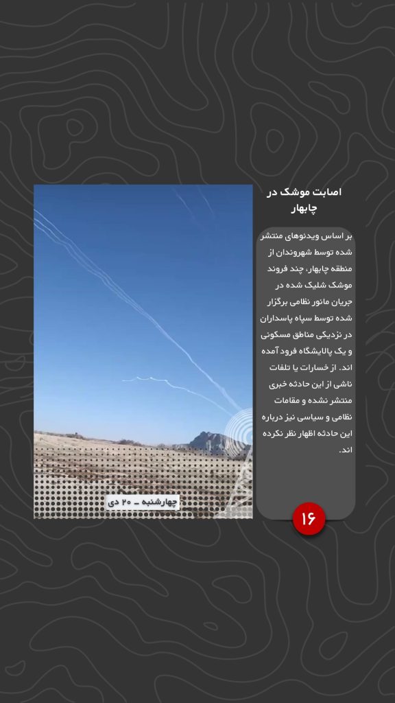 بر اساس ویدئوهای منتشر شده توسط شهروندان از منطقه چابهار، چند فروند موشک شلیک شده در جریان مانور نظامی برگزار شده توسط سپاه پاسداران در نزدیکی مناطق مسکونی و یک پالایشگاه فرود آمده اند. از خسارات یا تلفات ناشی از این حادثه خبری منتشر نشده و مقامات نظامی و سیاسی نیز درباره این حادثه اظهار نظر نکرده اند.