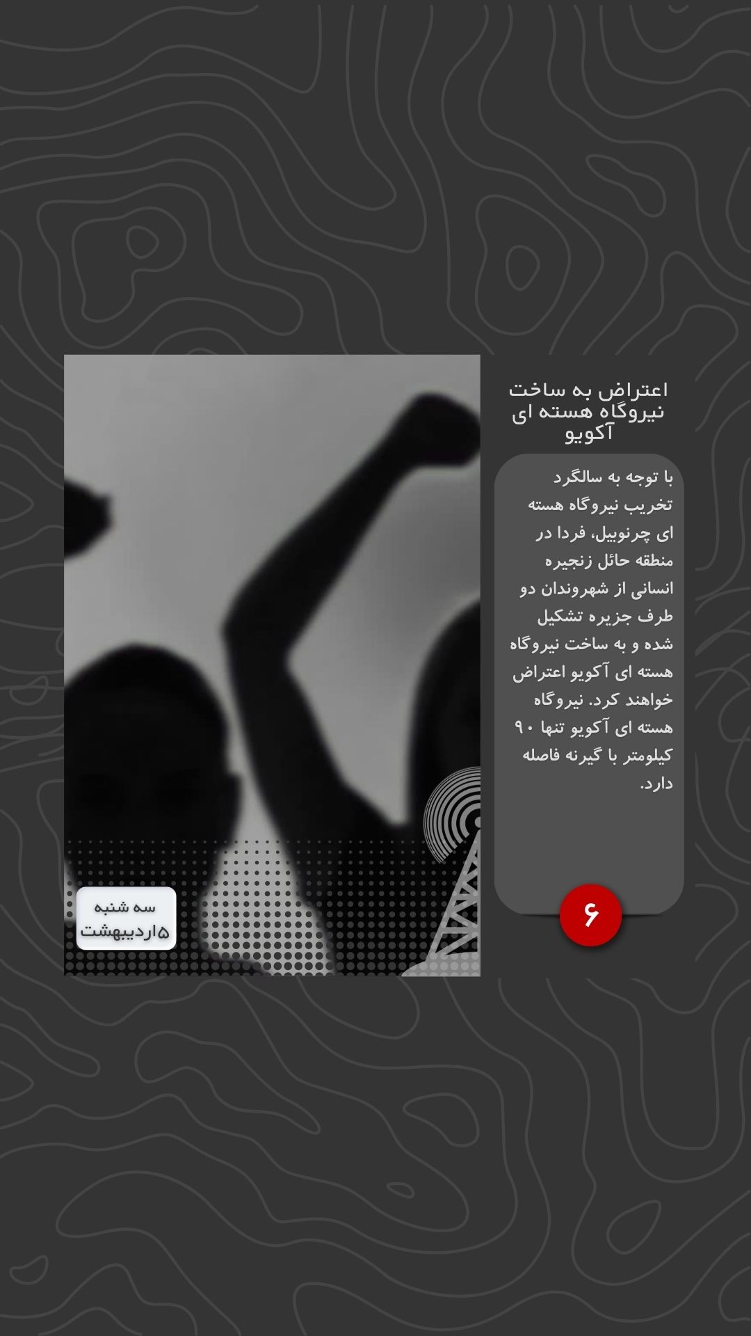 با توجه به سالگرد تخریب نیروگاه هسته ای چرنوبیل، فردا در منطقه حائل زنجیره انسانی از شهروندان دو طرف جزیره تشکیل شده و به ساخت نیروگاه هسته ای آکویو اعتراض خواهند کرد. نیروگاه هسته ای آکویو تنها ۹۰ کیلومتر با گیرنه فاصله دارد.