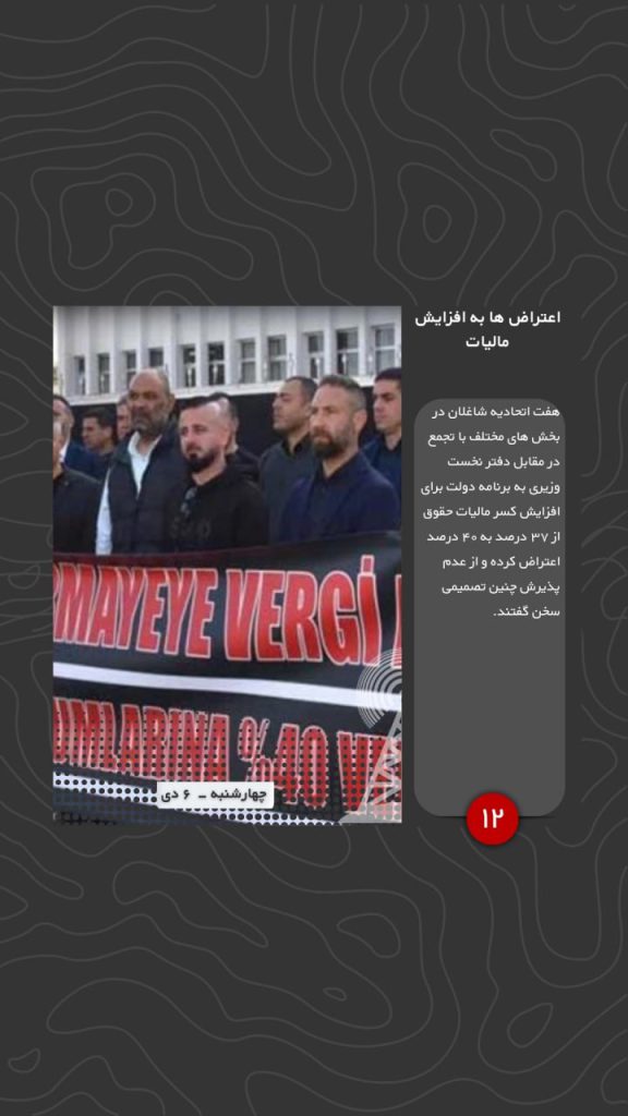 هفت اتحادیه شاغلان در بخش های مختلف با تجمع در مقابل دفتر نخست وزیری به برنامه دولت برای افزایش کسر مالیات حقوق از ۳۷ درصد به ۴۰ درصد اعتراض کرده و از عدم پذیرش چنین تصمیمی سخن گفتند.