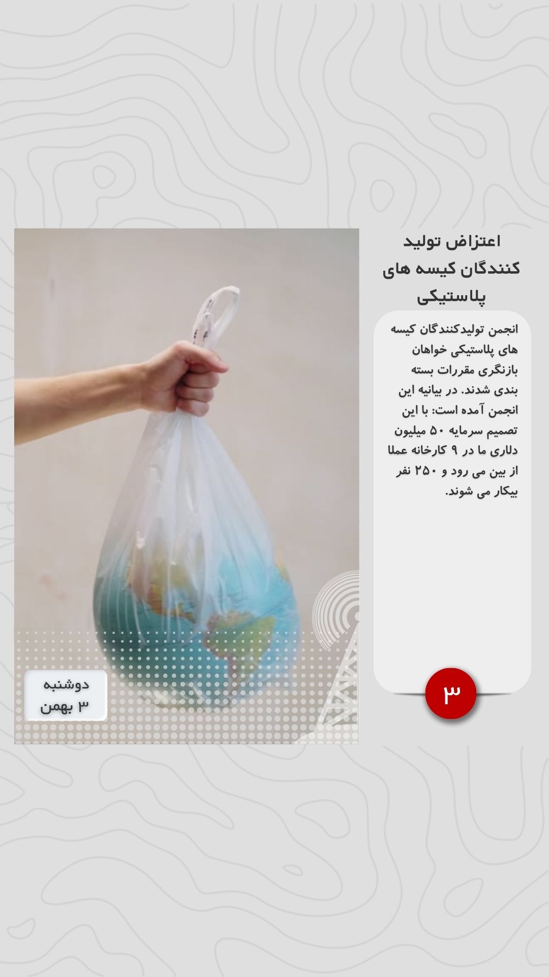 انجمن تولیدکنندگان کیسه های پلاستیکی خواهان بازنگری مقررات بسته بندی شدند. در بیانیه این انجمن آمده است: با این تصمیم سرمایه ۵۰ میلیون دلاری ما در ۹ کارخانه عملا از بین می رود و ۲۵۰ نفر بیکار می شوند.
