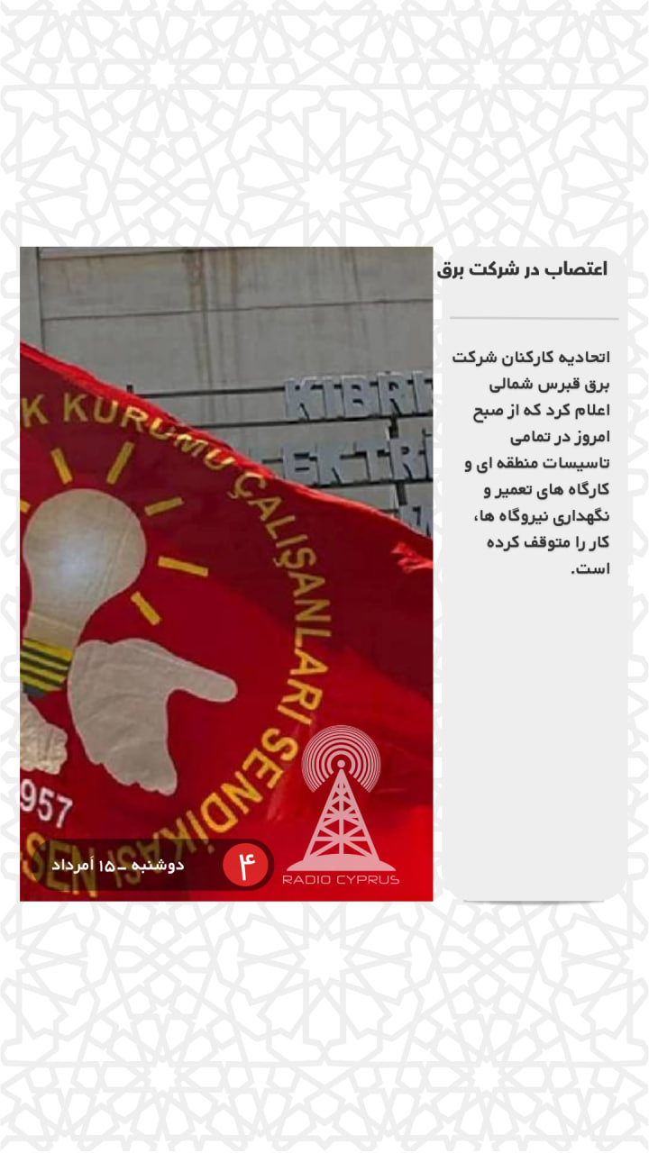 اتحادیه کارکنان شرکت برق قبرس شمالی اعلام کرد که از صبح امروز در تمامی تاسیسات منطقه ای و کارگاه های تعمیر و نگهداری نیروگاه ها، کار را متوقف کرده است.