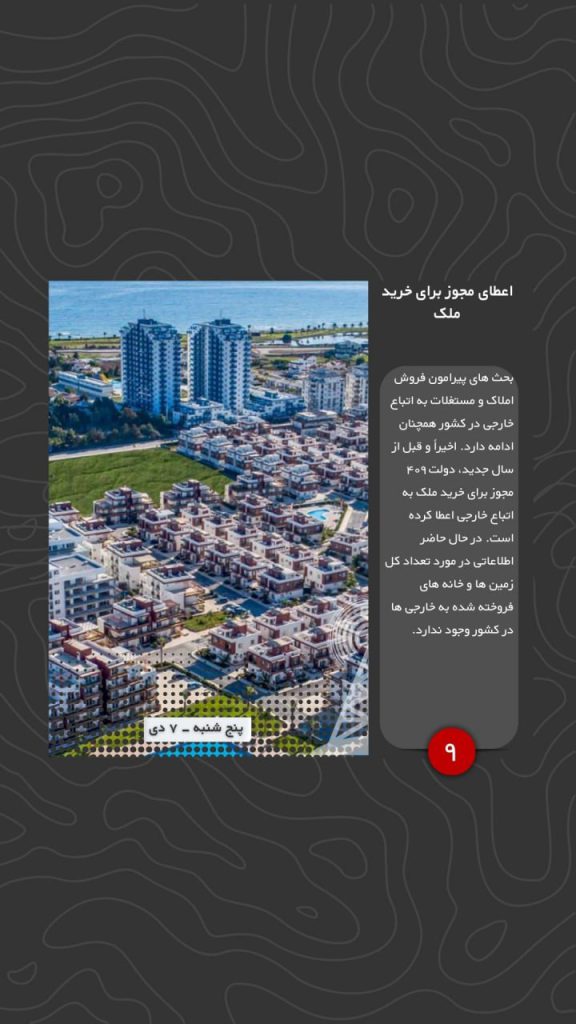 بحث های پیرامون فروش املاک و مستغلات به اتباع خارجی در کشور همچنان ادامه دارد. اخیراً و قبل از سال جدید، دولت ۴۰۹ مجوز برای خرید ملک به اتباع خارجی اعطا کرده است. در حال حاضر اطلاعاتی در مورد تعداد کل زمین ها و خانه های فروخته شده به خارجی ها در کشور وجود ندارد.