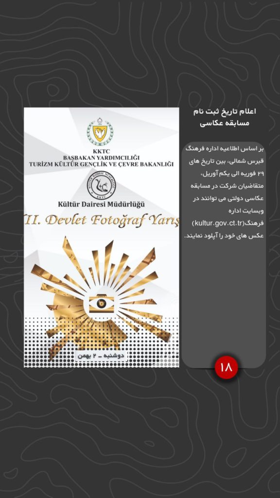 بر اساس اطلاعیه اداره فرهنگ قبرس شمالی، بین تاریخ های ۲۹ فوریه الی یکم آوریل، متقاضیان شرکت در مسابقه عکاسی دولتی می توانند در وبسایت اداره فرهنگ(kultur.gov.ct.tr) عکس های خود را آپلود نمایند.