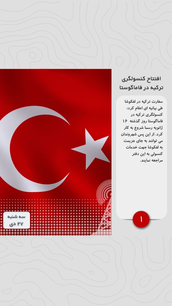 سفارت ترکیه در لفکوشا طی بیانیه ای اعلام کرد: کنسولگری ترکیه در فاماگوستا روز گذشته ۱۶ ژانویه رسما شروع به کار کرد. از این پس شهروندان می توانند به جای عزیمت به لفکوشا جهت خدمات کنسولی به این دفتر مراجعه نمایند.