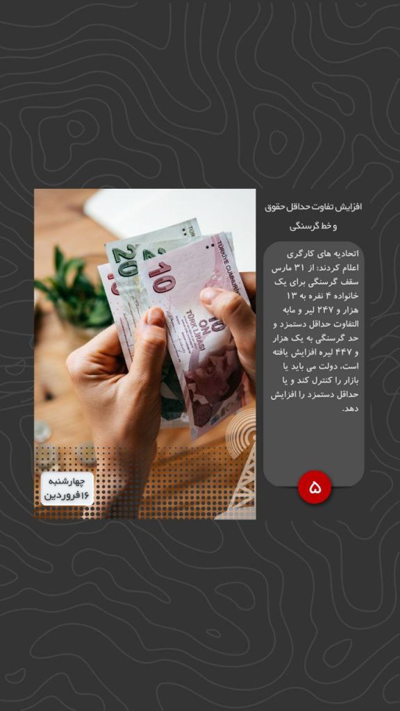 اتحادیه های کارگری اعلام کردند: از ۳۱ مارس سقف گرسنگی برای یک خانواده ۴ نفره به ۱۳ هزار و ۲۴۷ لیر و مابه التفاوت حداقل دستمزد و حد گرسنگی به یک هزار و ۴۴۷ لیره افزایش یافته است، دولت می باید یا بازار را کنترل کند و یا حداقل دستمزد را افزایش دهد.